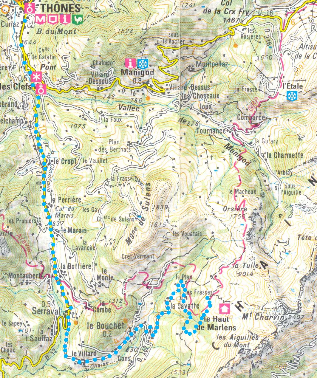 | Access: | From Thones, that can be reached either from Annecy orfrom St Jean de Sixt, we must take the route D12 to Serravat. Once there take D162 to Le Bouchet. One km after Le Bouchet take forestal road to the left driving across Banderelle, Les Provards, La Savatte and Le Plan. Continue along the same forestal road for about 5 km to arrive to the site of "Les Fontanettes". Park there. The trip to "Les Fontanettes" may take 1h40. |