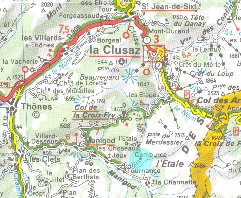 | Access: | Motorway to Bonneville. There take D12 to le Petit Bornand, Entremont, St Jean de Sixt. From St.Jean take D909 to la Clusaz and once there follow for about 2 km the road in direction to "col des Aravis". Then take road to the right driving to Manigod through the "Col de la Croix-Fry". In Manigod take road to "La Tournance". 250 m before La Tournance take road to the left to Combource. Park in Combource at the end of the road. The trip to Combource may take 1h30. |